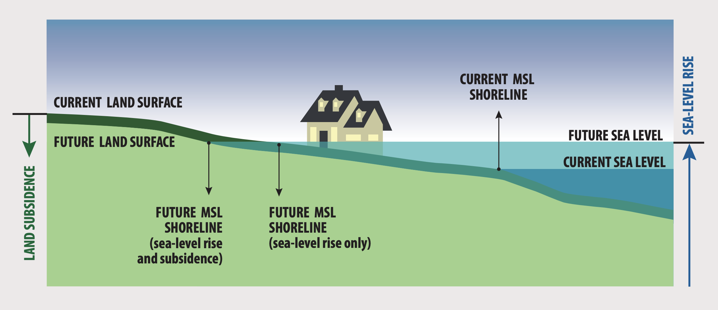 If the land is rising or falling, this also changes the sea level in that place. The term relative sealevel change describes the combined movement of both water and land (see image below). That is, even if sea level was constant there could still be changes in relative sea levels – rising land would produce a relative fall in sea level, while sinking land would produce a relative rise in sea level.